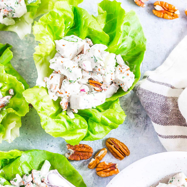 This Low-Carb Chicken Pecan Salad is a quick and easy dish made with chopped cooked chicken, parsley, pecans, red onion, and celery. It's mixed with a dressing of avocado oil mayonnaise, lemon juice, and wholegrain mustard, and served on lettuce leaves. This salad is perfect for meal prep as it can be stored in the refrigerator for up to five days. It's a nutritious option for a light lunch or snack.